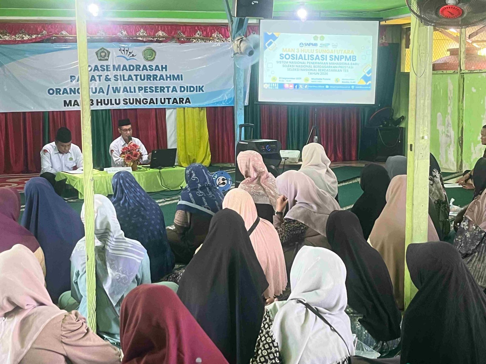 Amuntai (MAN 3 HSU) – Madrasah Aliyah Negeri (MAN) 3 Hulu Sungai Utara menggelar Sosialisasi Tes Kemampuan Akademik (TKA), Sistem Nasional Penerimaan Mahasiswa Baru (SNPMB), Seleksi Nasional Berdasarkan Prestasi (SNBP), dan Seleksi Nasional Berdasarkan Tes (SNBT) kepada orang tua/wali peserta didik kelas XII. Kegiatan dilaksanakan di Mushalla Putera MAN 3 HSU pada Selasa (23/9/2025).