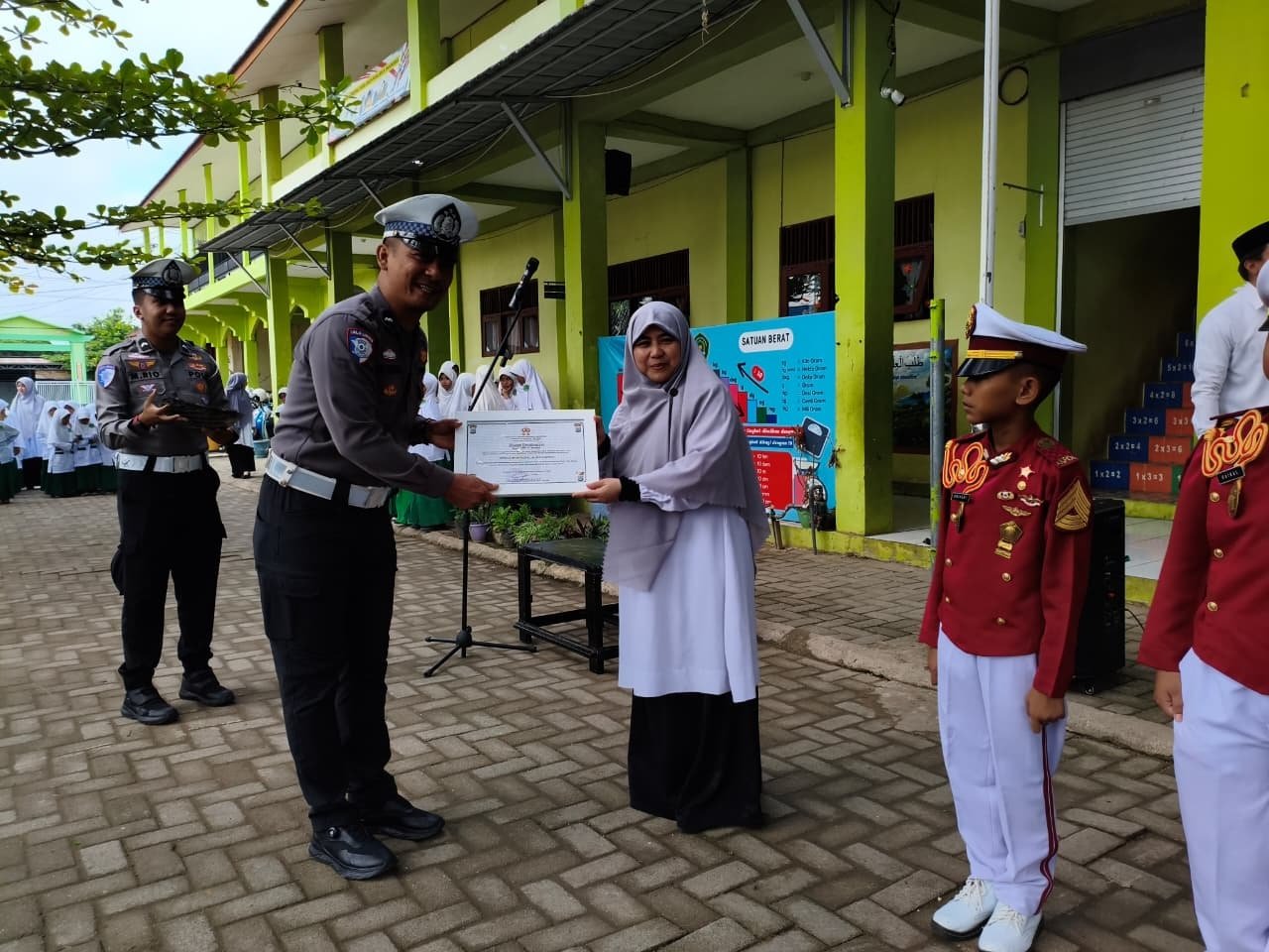 Dalam sambutannya, Aipda Edy Gusfa menyampaikan terima kasih kepada pihak madrasah yang telah berperan penting dalam pembinaan disiplin dan karakter peserta didik.