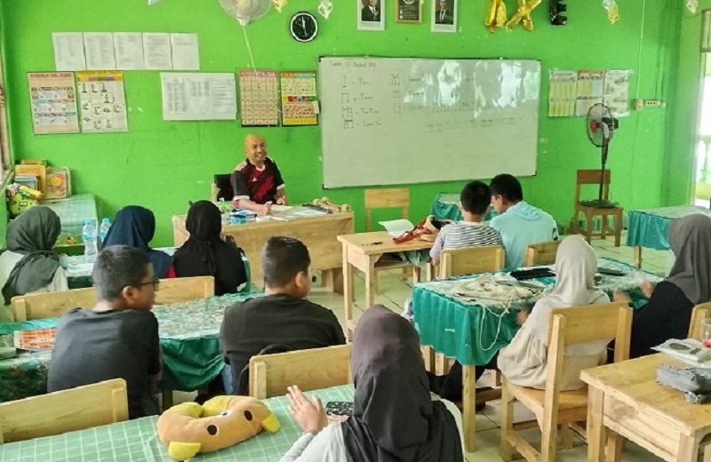 Amuntai (MTsN 2 HSU) – Anggota baru drum band Madrasah Tsanawiyah Negeri (MTsN) 2 Hulu Sungai Utara (HSU) di latih membaca partitur lagu-lagu di ruang kelas, Minggu (12/10/25).