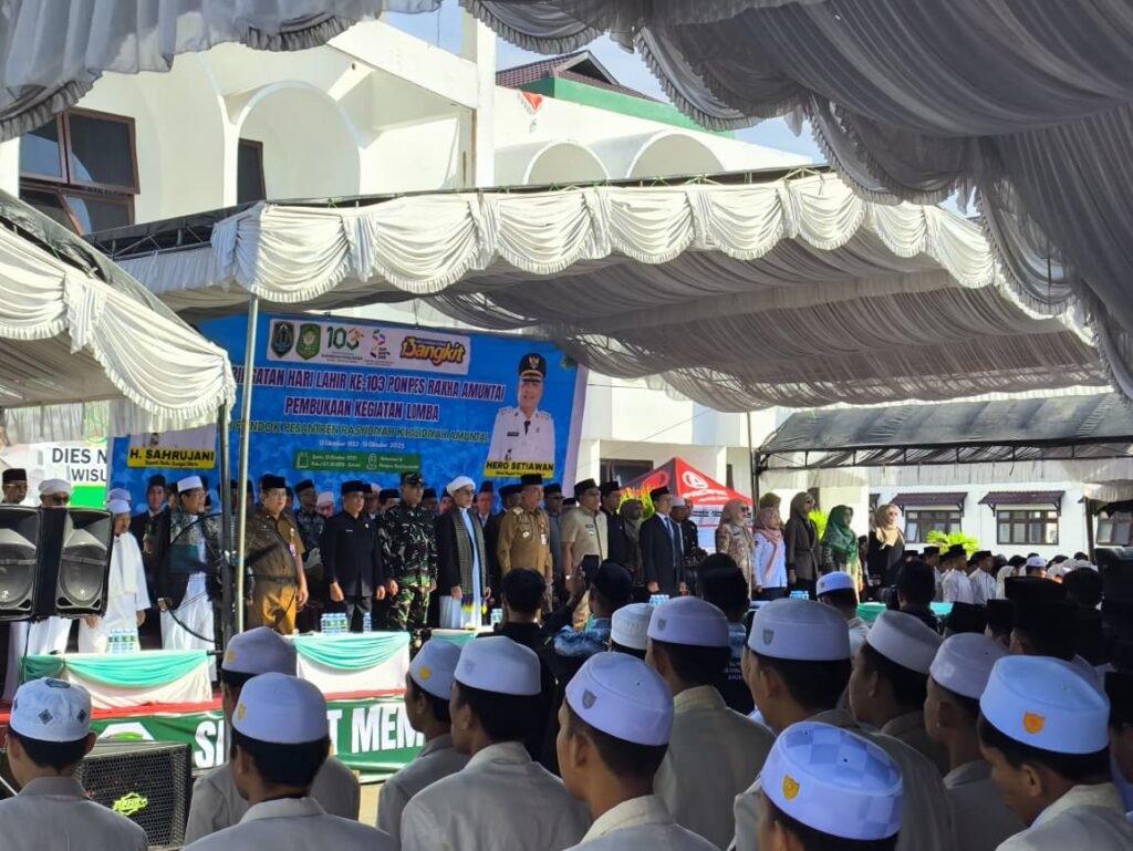 Amuntai (Kemenag HSU) – Pondok Pesantren Rasyidiyah Khalidiyah (Rakha) Amuntai memperingati Hari Lahir (Harlah) ke-103 tahun, Senin (13/10/25), di halaman pesantren. Acara puncak dihadiri Gubernur Provinsi Kalimantan Selatan yang dalam hal ini diwakili oleh Staf Ahli Bidang Pemerintahan dan Politik Provinsi Kalimantan Selatan, Adi Santoso, Kepala Kantor Wilayah Kementerian Agama Provinsi Kalimantan Selatan yang dalam hal ini diwakili oleh Kepala Kantor Kementerian Agama Kabupaten Hulu Sungai Utara Hj. Nahdiyatul Husna, Bupati Hulu Sungai Utara H. Sahrujani, Ketua DPRD Kabupaten Hulu Sungai Utara H. Fadilah beserta anggota DPRD HSU, Jajaran Forkopimda HSU, pimpinan pondok pesantren, dewan guru, santri, dan para tamu undangan lainnya.