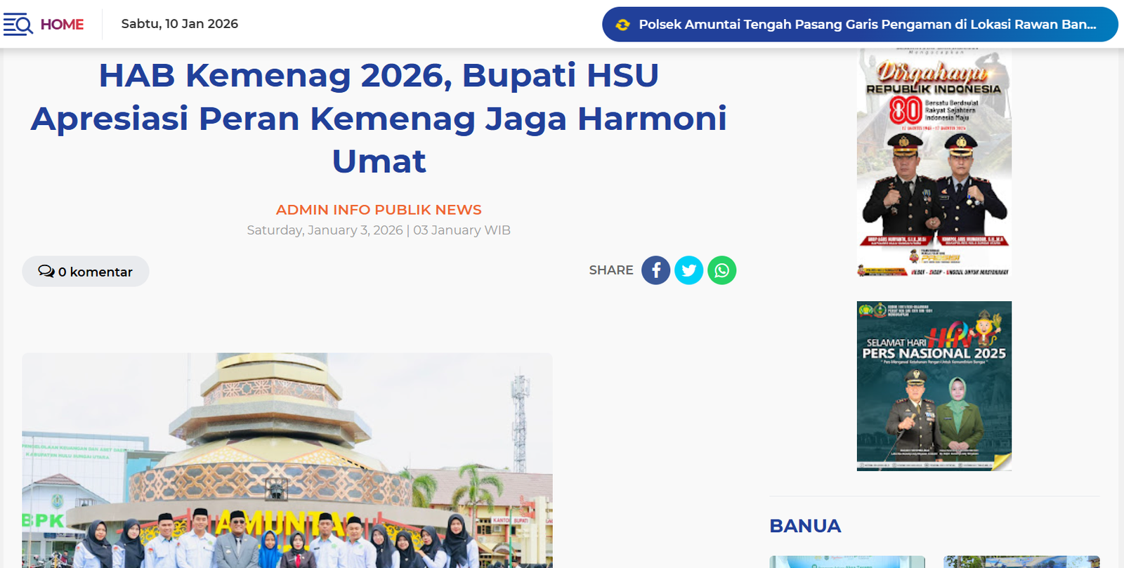 Berita Media HAB Kemenag 2026, Bupati HSU Apresiasi Peran Kemenag Jaga Harmoni Umat kemenaghulusungaiutara January 10, 2026January 10, 20262 min readWrite a Comment on HAB Kemenag 2026, Bupati HSU Apresiasi Peran Kemenag Jaga Harmoni Umat Telah Dibaca : 114