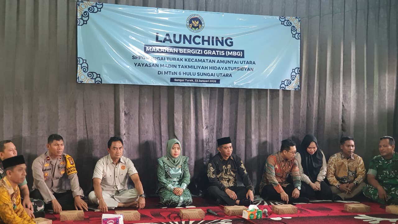 Amuntai (Kemenag HSU)-Kepala Kantor Kementerian Agama Kabupaten Hulu Sungai Utara, Hj. Nahdiyatul Husna, mengikuti rangkaian kegiatan peluncuran Satuan Pelayanan Pemenuhan Gizi (SPPG) Program Makan Bergizi Gratis (MBG), yang dikelola oleh Yayasan Madin Takmiliyah Hidayatussibyan, di MTsN 6 HSU, Desa Sungai Turak, Kecamatan Amuntai Utara, Kamis (22/1/26).
