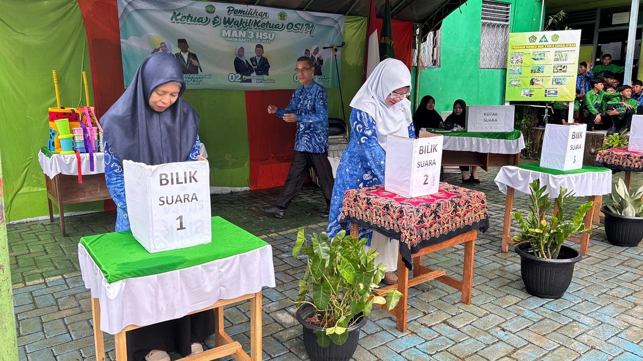 Amuntai (MAN 3 HSU) – Madrasah Aliyah Negeri 3 Hulu Sungai Utara (MAN 3 HSU) sukses menyelenggarakan pesta demokrasi melalui pemilihan Ketua dan Wakil Ketua Organisasi Siswa Intra Madrasah (OSIM) masa bakti 2026/2027 pada Kamis (12/02). Bertempat di halaman utama madrasah, kegiatan ini diikuti oleh tiga pasangan calon yang bersaing memperebutkan mandat kepemimpinan siswa. Seluruh warga madrasah, mulai dari peserta didik, tenaga pendidik, hingga staf kependidikan, menggunakan hak suaranya secara langsung, umum, bebas, dan rahasia guna menentukan arah organisasi satu tahun ke depan.
